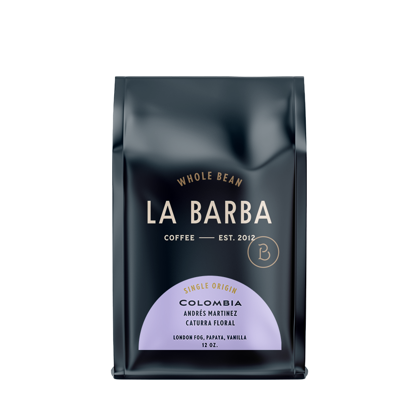 The image features a 12oz bag of La Barba Coffee, specifically their Colombia Andres Martinez Caturra Floral. The bag is designed with a dark background, prominently displaying the brand name "La Barba" in large, elegant letters. It highlights the coffee's origin, Colombia, along with a description of the flavor profile, including notes of london fog, papaya, and vanilla. The design exudes a premium and modern feel with a minimalist, sophisticated look.